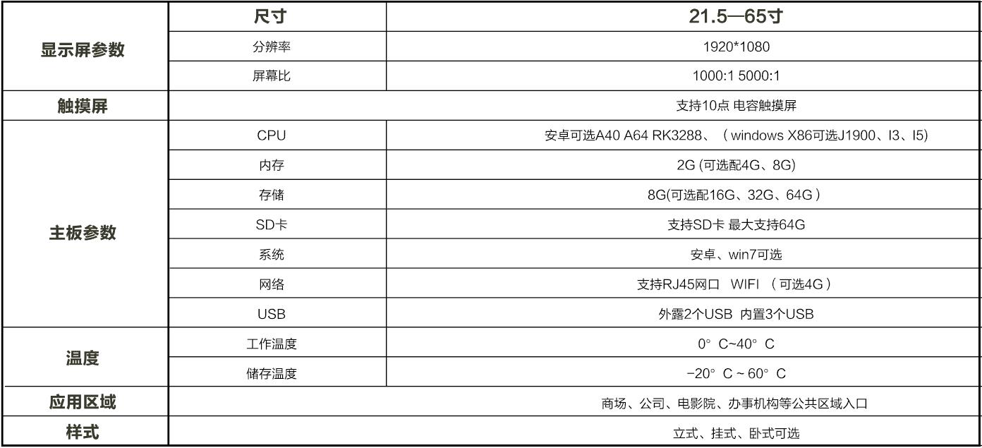 超薄機身;質(zhì)感拉絲金屬;高清畫(huà)質(zhì);觸摸極速反應;智能分屏;智能遠程信息發(fā)布;可定時(shí)開(kāi)關(guān)機;提前設定節目源;鋼化玻璃屏幕;可定制專(zhuān)屬LOGO、多種顏色、尺寸可選。